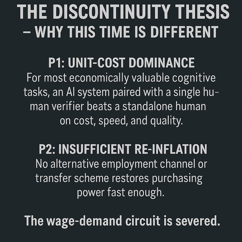 Premise 1 is almost bullet proof because it combines demonstrably falling AI marginal costs, verifier schemes whose cost dilutes with scale, and economic arbitrage that relentlessly selects the cheapest adequate performer. Disproving the Discontinuity Thesis therefore requires either technical evidence that AI cannot clear the cost quality bar or policy economic proof that society will counteract the resulting demand shock quickly and comprehensively. Until such evidence appears, the syllogism remains intact.